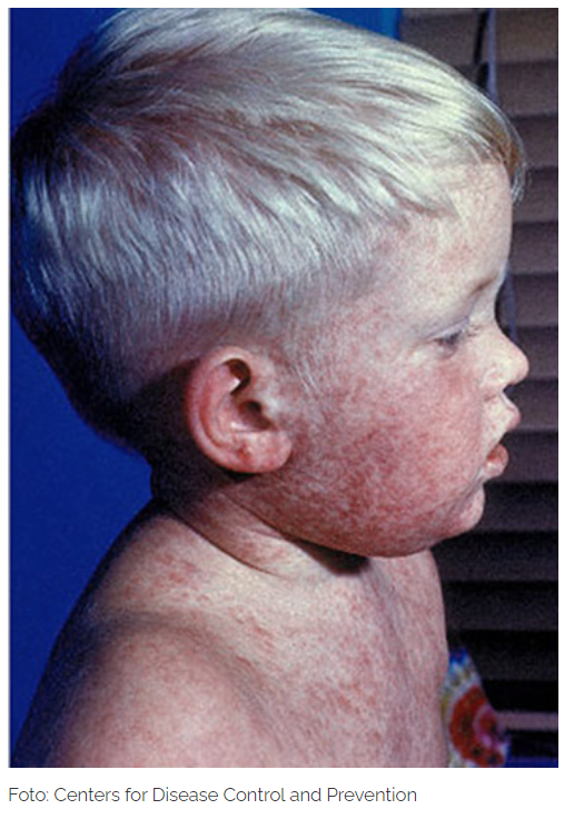 Symptome: Fieber, Schnupfen, Husten, gerötete Augen und Halsschmerzen. Später folgt ein Hautausschlag, der sich über den ganzen Körper verteilt.